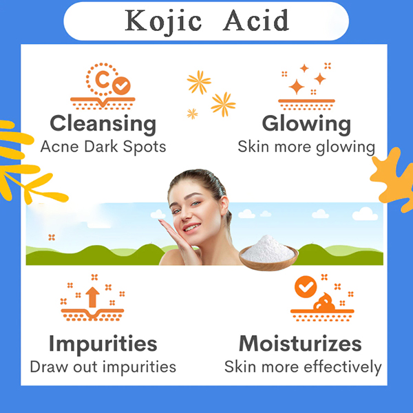 In whitening products, kojic acid can be used as the main whitening ingredient or as an auxiliary ingredient. It can be added to facial cleansers, facial masks, essences, lotions and other products to lighten spots, reduce melanin, brighten skin tone, etc. As a whitening raw material, kojic acid can improve skin pigmentation problems and make skin whiter and more even.