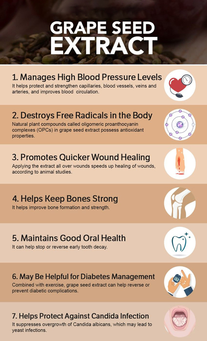 2. Forbedrer hjerte-kar-sundheden: Vindruekerneekstrakt menes at understøtte hjerte-kar-sundheden ved at forbedre blodcirkulationen, sænke blodtrykket og forbedre kolesterolniveauet i blodet.