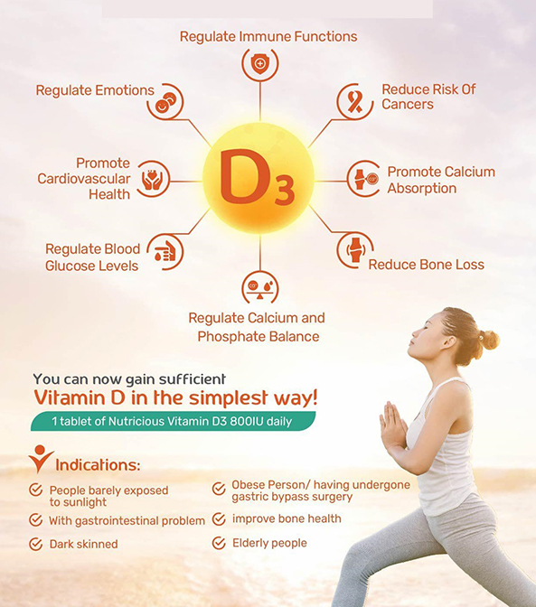 D3-vitamiinin päätehtävät elimistössä ovat kalsiumin ja fosforin imeytymisen parantaminen suolistossa sekä luiden muodostumisen ja ylläpidon edistäminen.