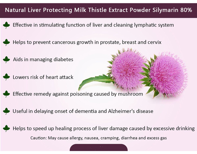 1. Боор ооруларын дарылоо: Силимарин боор менен байланышкан ооруларды дарылоодо кеңири колдонулат. Ал боордун бузулган клеткаларын коргойт жана калыбына келтирет, токсиндерден жана дарылардан боордун бузулуу коркунучун азайтат. Силимарин ошондой эле өнөкөт гепатиттин, майлуу боордун, цирроздун жана башка оорулардын симптомдорун жакшыртууга жана боордун иштешин калыбына келтирүүгө жардам берет.