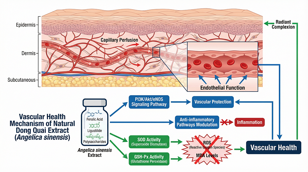 For skin, this vascular dimension is critical. Capillary perfusion and dermal oxygenation strongly influence complexion, particularly in individuals with sallow or fatigued tones. By supporting endothelial function and antioxidant defenses within the vasculature, Natural Dong Quai Extract has the potential to enhance micro‑circulation and nutrient delivery to the dermis. This introduces the idea of “circulatory brightening”: a more physiologic form of glow driven by improved blood flow and oxygenation, rather than purely by pigment suppression.