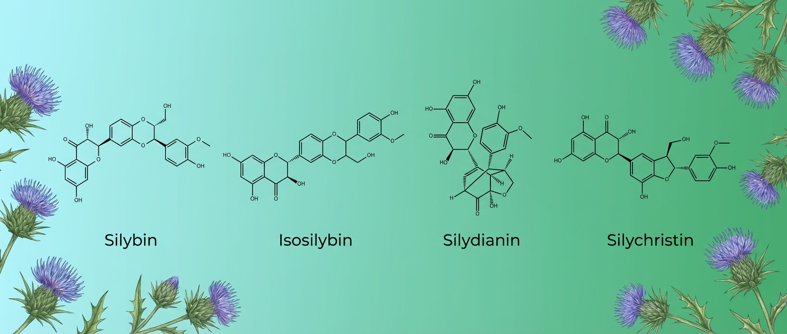 | Isosilybin | C25H22O10 | Free radical scavenging, membrane stabilization, inhibits NF-κB pathway to reduce inflammation | Supports antioxidant defense and inflammation control |